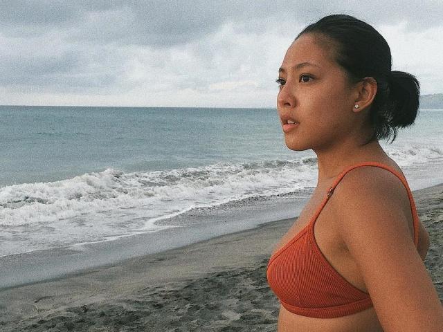 Suot ang kanyang orange na bikini, game na game siyang nag-pose sa dalampasigan.
