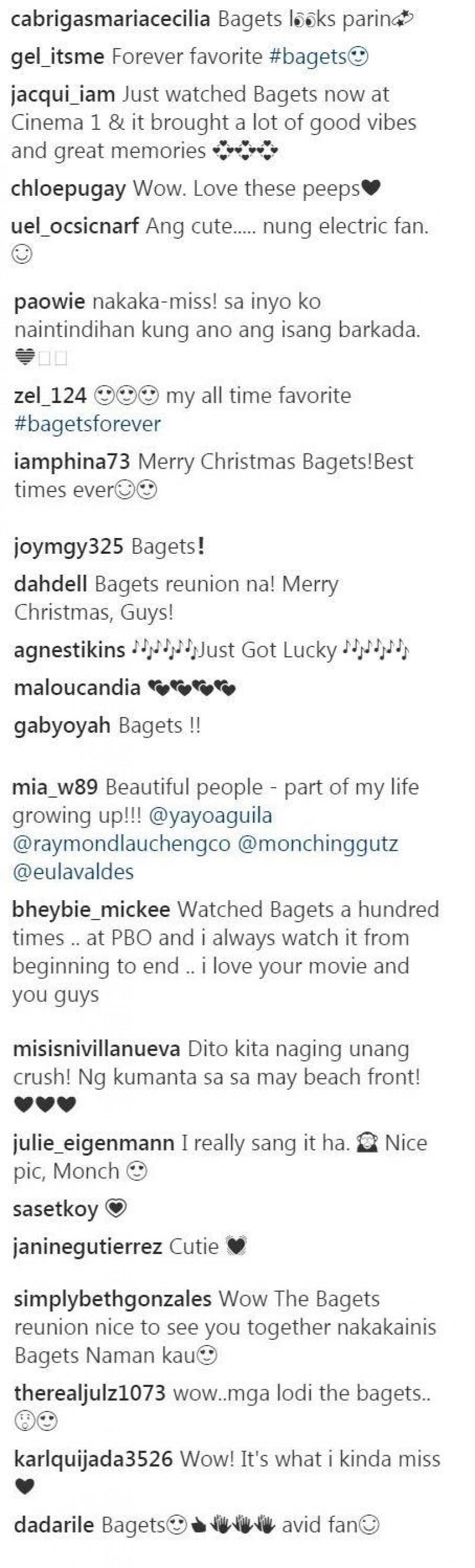 Ikinatuwa ng netizens nang makita sa social media ang Christmas reunion ng cast ng sikat na pelikula noong '80s na Bagets. Makikita sa Instagram accounts nina Eula Valdes, Yayo Aguila, Ramon Christopher at Raymond Lauchengco ang kanilang group picture kasama sina Herbert Bautista at Cheska Iñigo.