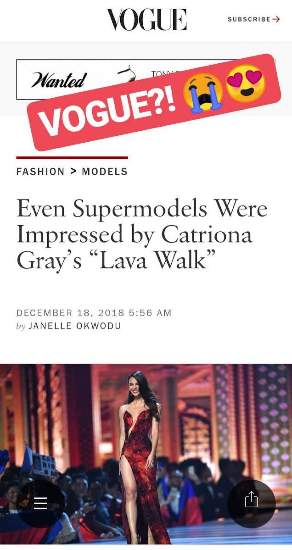 Catriona's performance even caught the attention of Vogue, an international fashion and lifestyle magazine. The newly-crowned Miss Universe was featured on Vogue for her "lava walk" which supermodels Tyra Banks and Ashley Graham have highly commended.
