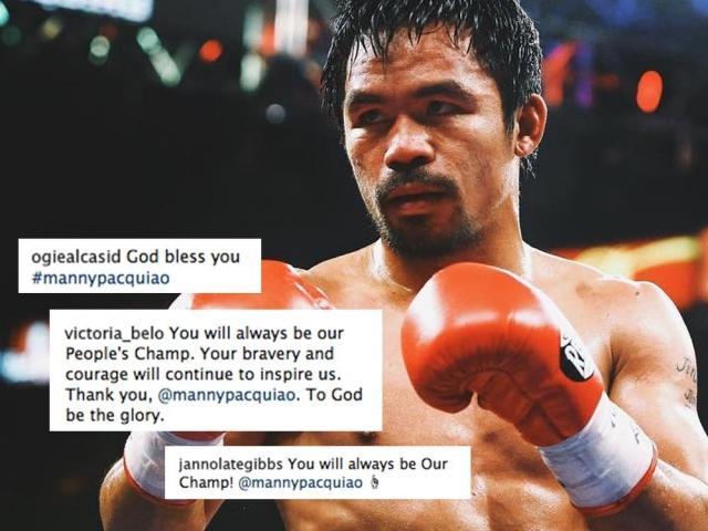 Kahit natalo man si Manny Pacquiao sa kaniyang laban kay Jeff Horn, panalo pa rin ang People's Champ sa puso ng maraming Pilipino. Sa Instagram, ipinaabot ng ilang Pinoy celebrities ang kanilang pagbati at mensahe para kay Manny.