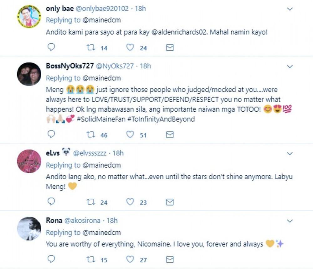Maine’s sister Coleen Mendoza replied, “Always here, always” and retweeted her post.