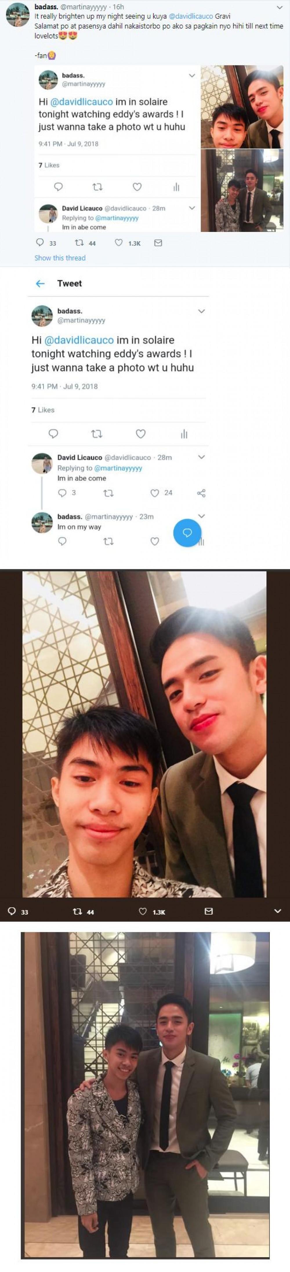 Isang netizen ang nagbahagi ng kaniyang experience patungkol kay David nang pagbigyan siya nito na makapagpa-selfie kahit busy sa pinuntahan niyang event sa The Theatre sa Solaire.