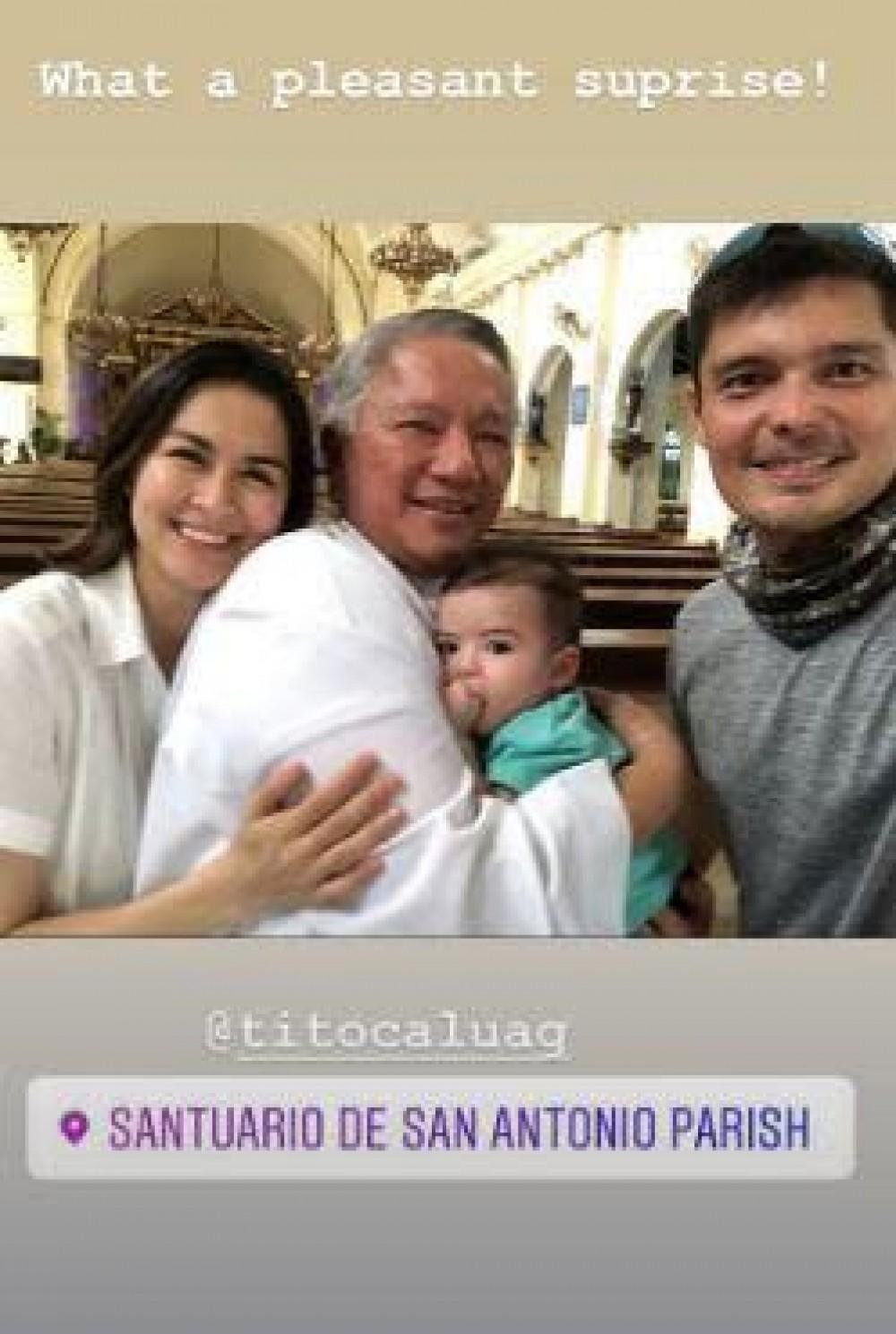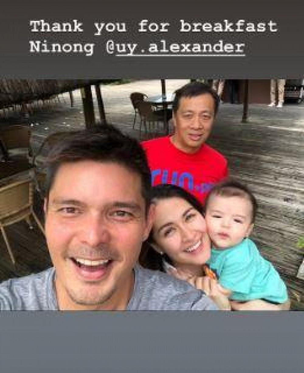 The Descendants of the Sun actor shared a photo of his wife Marian Rivera and their youngest child Baby Ziggy who were cheering him on during training. “My pampagana visitors during this morning's training.”