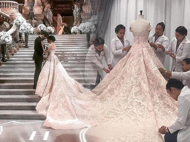 In a behind-the-scenes video at Michael Cinco's atelier, the wedding gown can be seen being embroidered and stoned with rose opal Swarovski crystals.