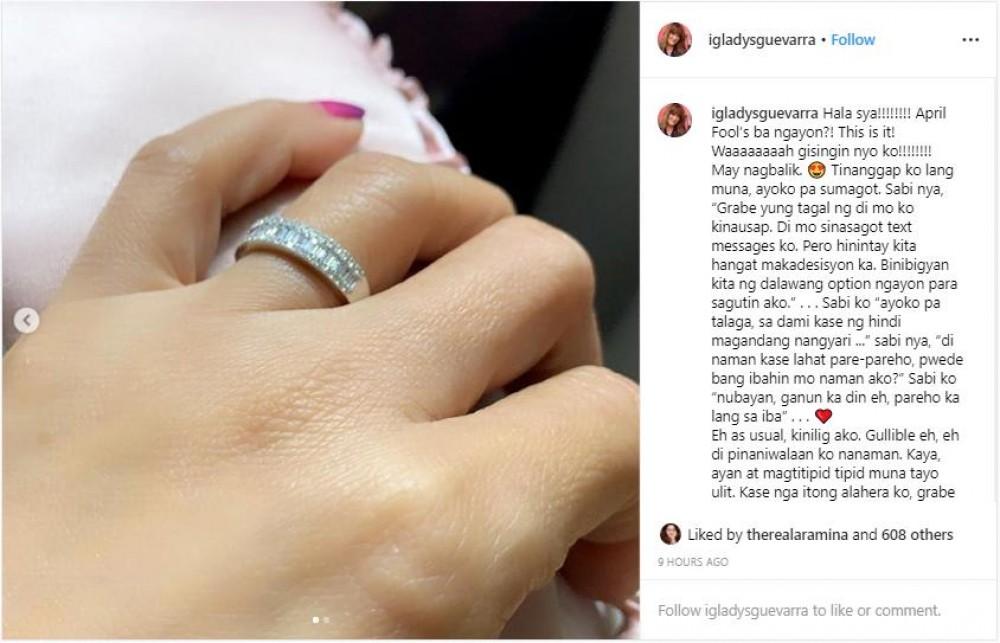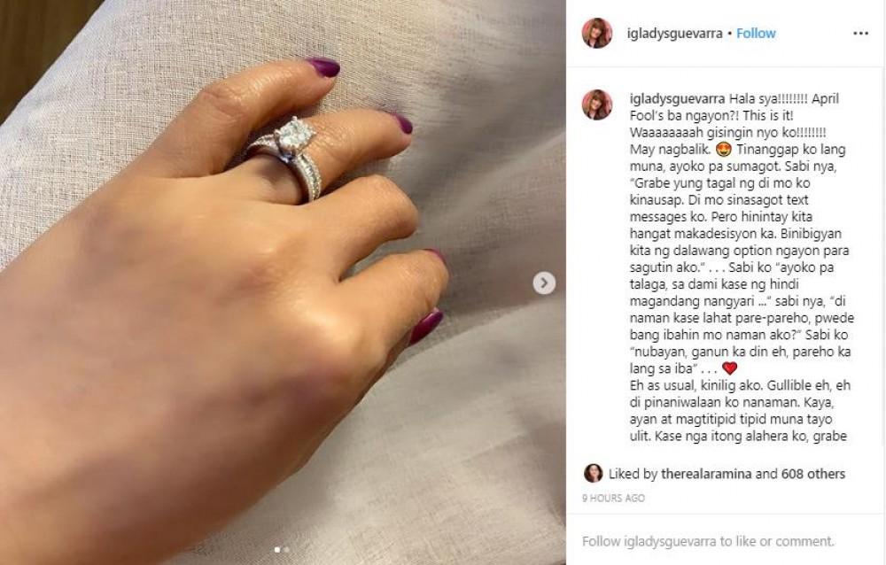 Isang malaking singsing ang bumati sa Instagram feed ng netizens ngayong umaga nang ipakita ni Sunday PinaSaya comedienne Gladys Guevarra ang kaniyang “engagement” ring.