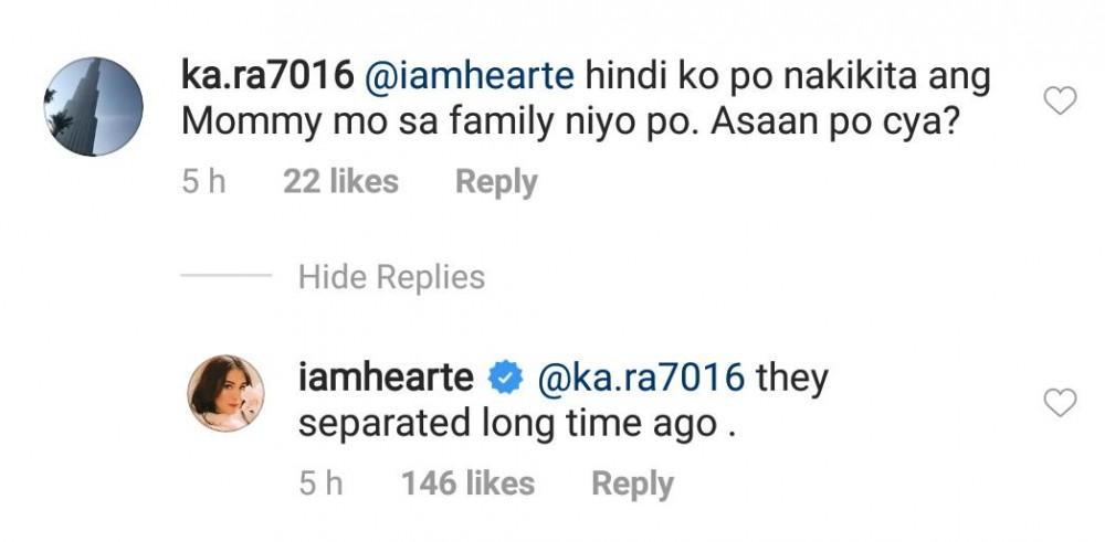 However, questions regarding the absence of her mother started to pour in. An Instagram user who goes by the handle @ka.ra7016 asked, "hindi ko po nakikita ang Mommy mo sa family niyo po. Asaan po cya?"