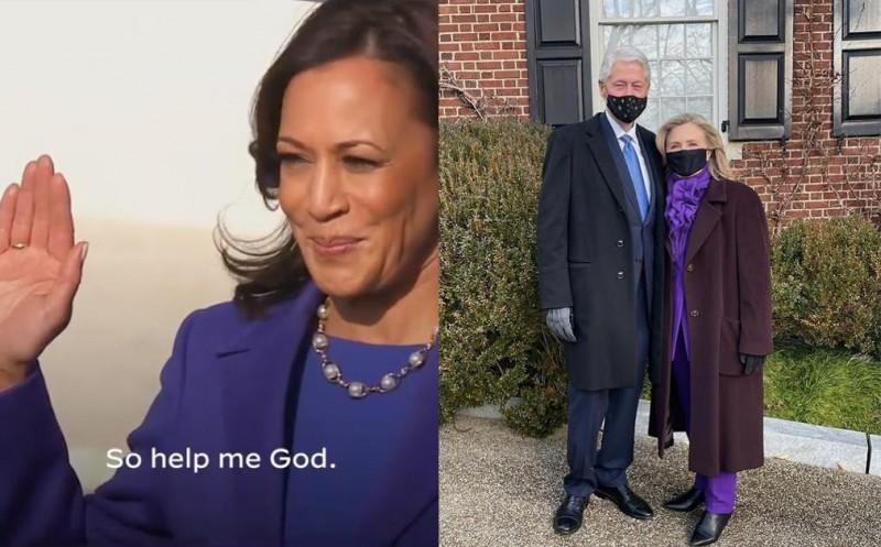 Vice President Kamala Harris, the first female and first black and Asian-American to become VP, wore purple when she was sworn into office by Supreme Court Justice Sonia Sotomayor.
