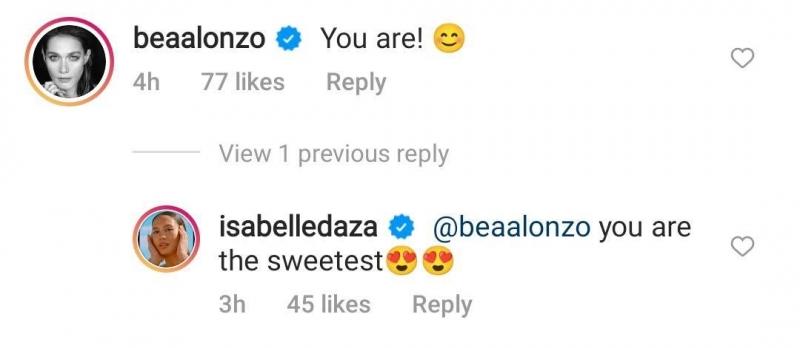 New Kapuso star Bea Alonzo replied to her post saying, “You are (smiley face emoji)” to which Isabelle replied back, “@beaalonzo you are the sweetest”