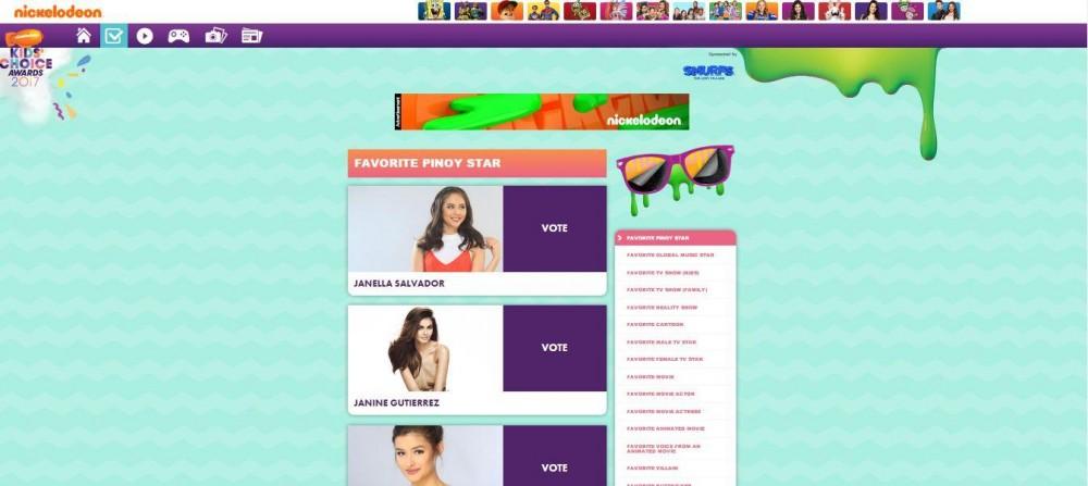 You can show you support to our Kapuso Janine by logging into Nickelodeon Asia website (http://kca.nick-asia.com/vote#cat=Favorite-Pinoy-Star)  and follow the instructions on how to vote.