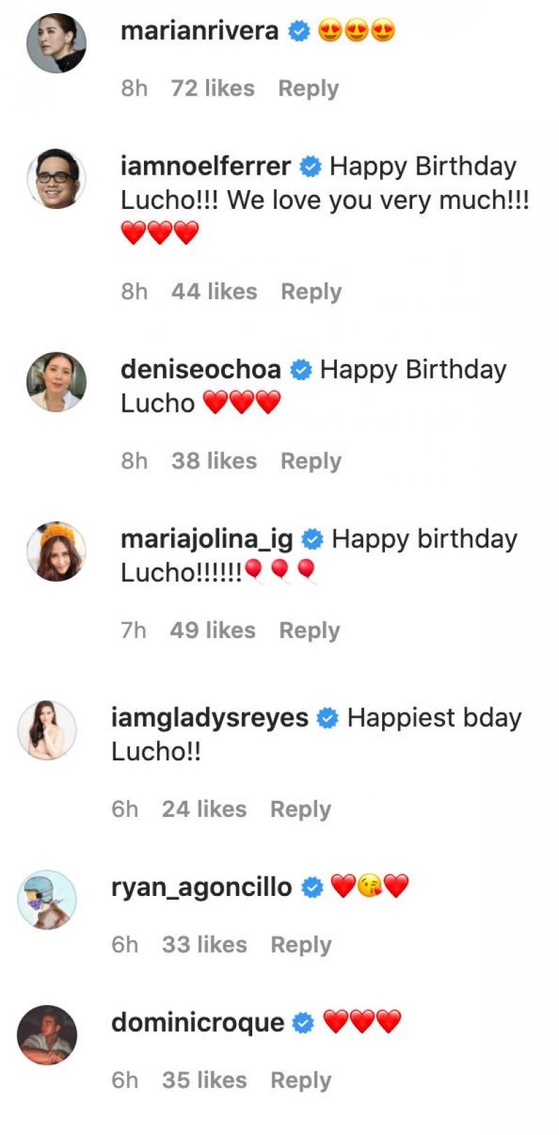 In the comments section, several celebrities joined in greeting Lucho a happy birthday. Among them are Marian Rivera, Jolina Magdangal, Gladys Reyes, and Dominic Roque.