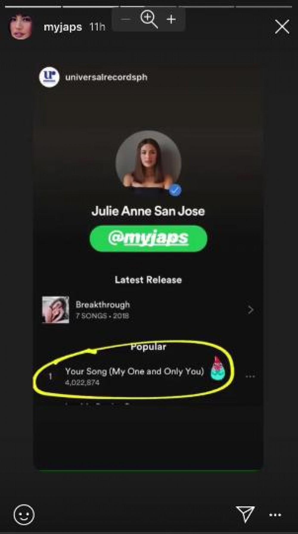 Asia's Pop Sweetheart Julie Anne San Jose's single "Your Song" from her 'Breakthrough' album is one of the most popular songs in Spotify.