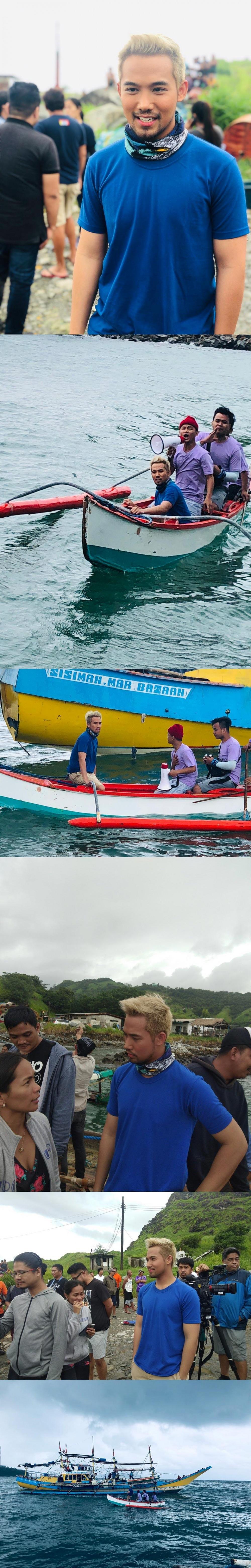 In a series of behind-the-scenes photos, the Kapuso actor is seen with tan skin and bleached hair as he leads a boat ride and braving the sea.