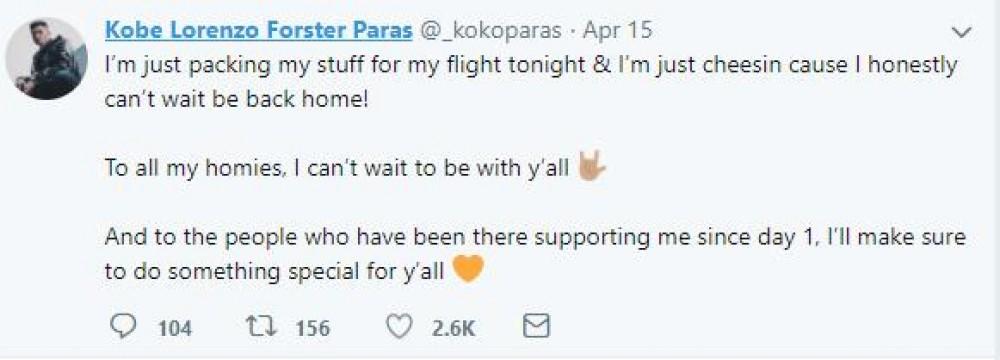 The son of PBA legend Benjie Paras also announced that he is set to return to the Philippines. Several sports websites have reported that the younger Paras will join the training of the Gilas Pilipinas squad.