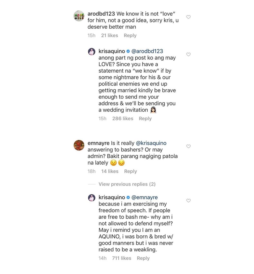 Aniya, “Because I am exercising my freedom of speech. If people are free to bash me—why am I not allowed to defend myself? May I remind you I am an Aquino, I was born and bred with good manners but I was never raised to be a weakling.”