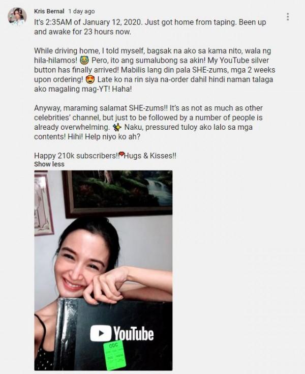 Actress Kris Bernal has finally received her YouTube Silver Play Button after her channel reached 100k subscribers.