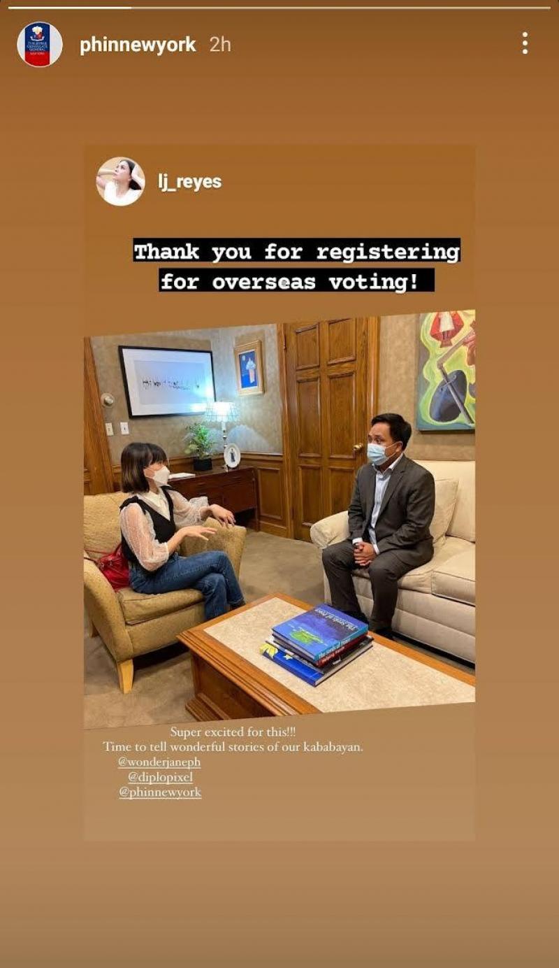 The Philippine Consulate in New York also reposted a photo of LJ and Arman, who were having a chat, and wrote, “Thank you for registering for overseas voting!”