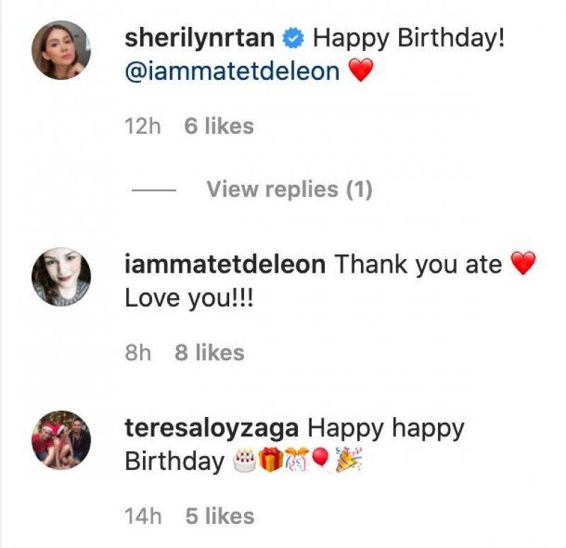 Celebrity friends also joined in greeting Matet a happy birthday. Actresses Sherilyn Reyes-Tan and Teresa Loyzaga also wished Matet a happy birthday. Matet, for her part, thanked Lotlot in the comments and told her she loved her.
