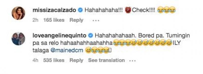 "Hahahahahaah. Bored pa. Tumingin pa sa relo hahaahahhaahahha ILY talaga mainedcm,” Angeline wrote.