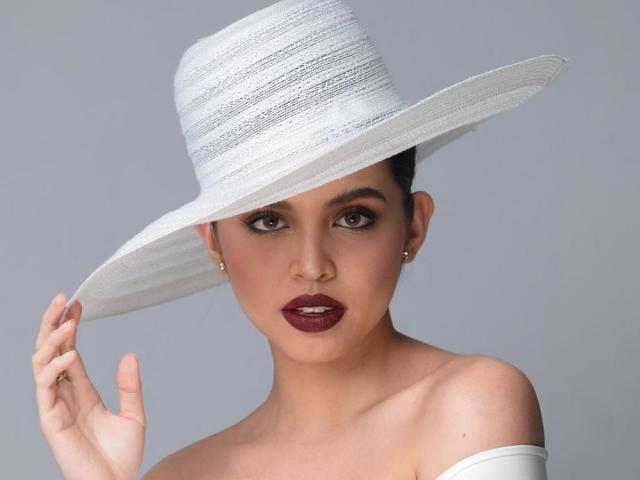 Maine is seen channeling old Hollywood glam while wearing a white dress complemented with a white brimmed hat.