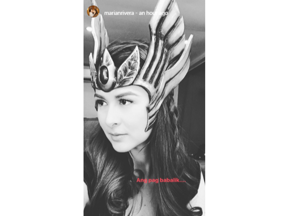 Muling mapapanood si Kapuso Primetime Queen Marian Rivera na kilala bilang Ynang Reyna Minea sa GMA Telebabad soap. Sa kanyang Instagram, ibinahagi ng aktres ang kanyang larawan na suot ang headgear ng namatay niyang karakter.