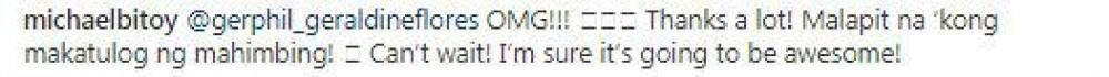 Bitoy replied, “@gerphil_geraldineflores OMG!!! Thanks a lot! Malapit na ‘kong makatulog ng mahimbing!  Can’t wait! I’m sure it’s going to be awesome!”