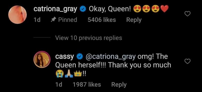 The Filipina-Australian beauty herself approved of Cassy's look and commented, “Okay, Queen!” to which Cassy replied, “@catriona_gray Omg! The Queen herself!!! Thank you so much!”