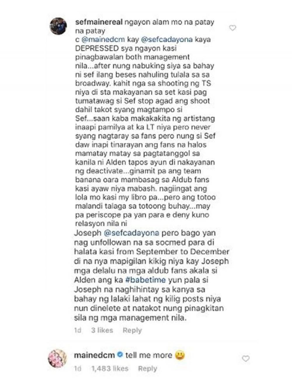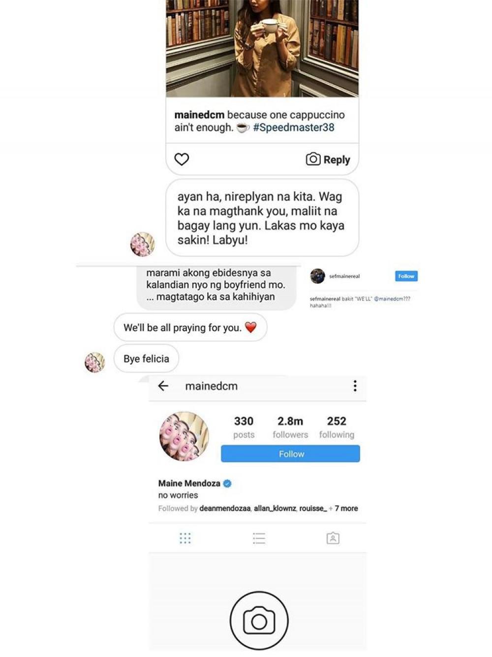 Netizen @sefmainereal hounded the Instagram account of Maine and accused her of having an affair with another actor without any basis or hard evidence.