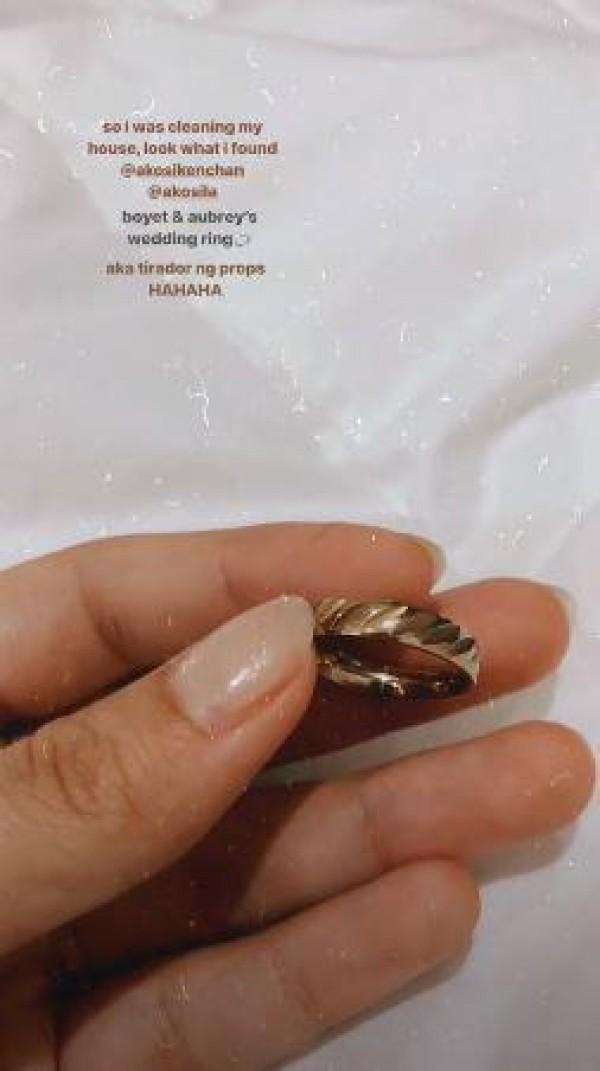Kuwento ni Rita sa kaniyang Instagram story, “So I was cleaning my house, look what I found @akosikenchan, Boyet and Aubrey's wedding ring. Ako tirador ng props.”
