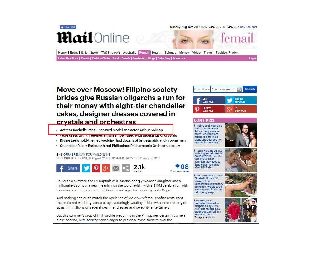 The dream wedding of former SexBomb dancer Rochelle Pangilinan and Pepito Manaloto star Arthur Solinap didn’t just create a lot of buzz in the country. The global community also took notice of the lavish ceremony attended by the biggest stars in Philippine showbiz.