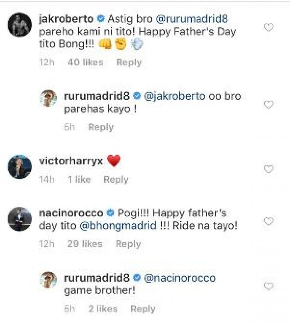 “I love you da! Kulang pa yan sa lahat ng ginawa mo sa amin ng pamilya mo sa lahat ng sakripisyo at pagtataguyod sa aming lahat lalong lalo na ang pagmamahal na binibigay mo sa amin na alam ko na walang kahit anong bagay ang maitutumbas sa lahat ng ginawa mo sa amin. Happy father’s day da! Mahal ka namin :) @bhongmadrid”