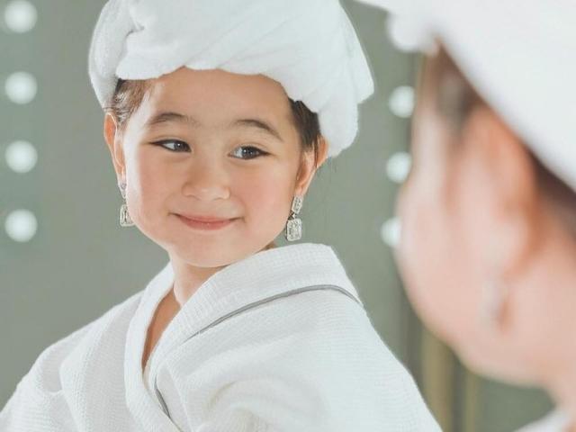 The three-year-old daughter of Vicki Belo and Hayden Kho looked adorable in a white robe, with a towel wrapped on her head and drop earrings.