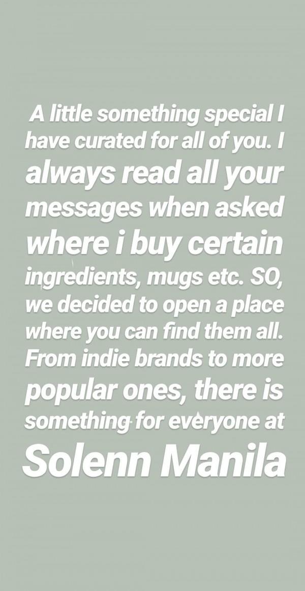 She said, "A little something special I have curated for all of you. I always read all your messages when asked where I buy certain ingredients, mugs etc. So, we decided to open a place where you can find them all. From indie brands to more popular ones, there is something for everyone at Solenn Manila."