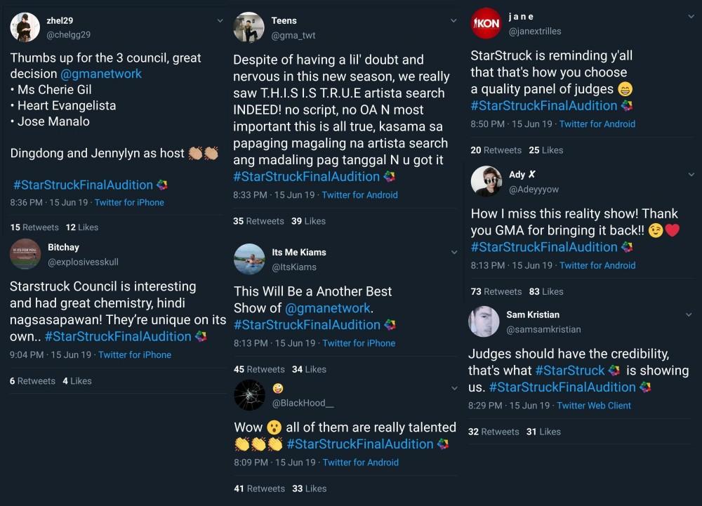 The original reality-based artista search also gained positive reviews from netizens, particularly for having credible StarStruck council members, and for giving fair chances to real, raw talent.