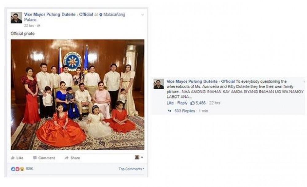 Netizens were puzzled why the common law wife of President Rodrigo “Digong” Duterte and their daughter Veronica “Kitty” Duterte was not included in the presidential family photo uploaded by Duterte’s son, Vice Mayor Paolo “Pulong” Duterte, on Facebook.