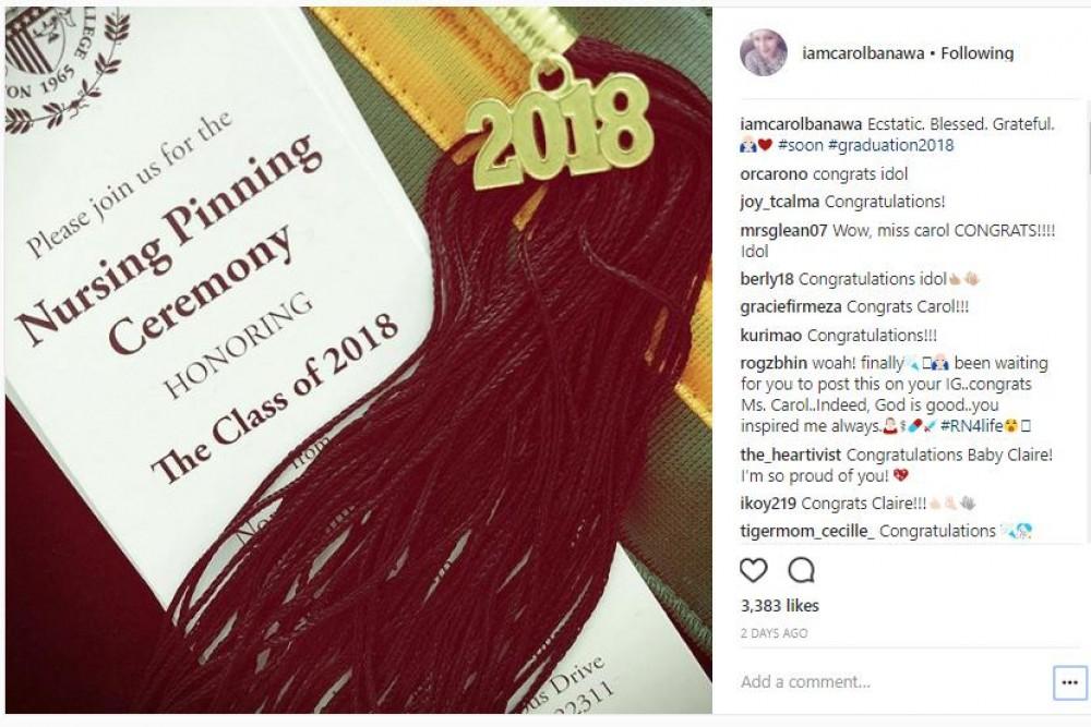 Kasama sa mga magtatapos ngayong 2018 sa kursong nursing ang US-based Filipino singer na si Carol Banawa.
