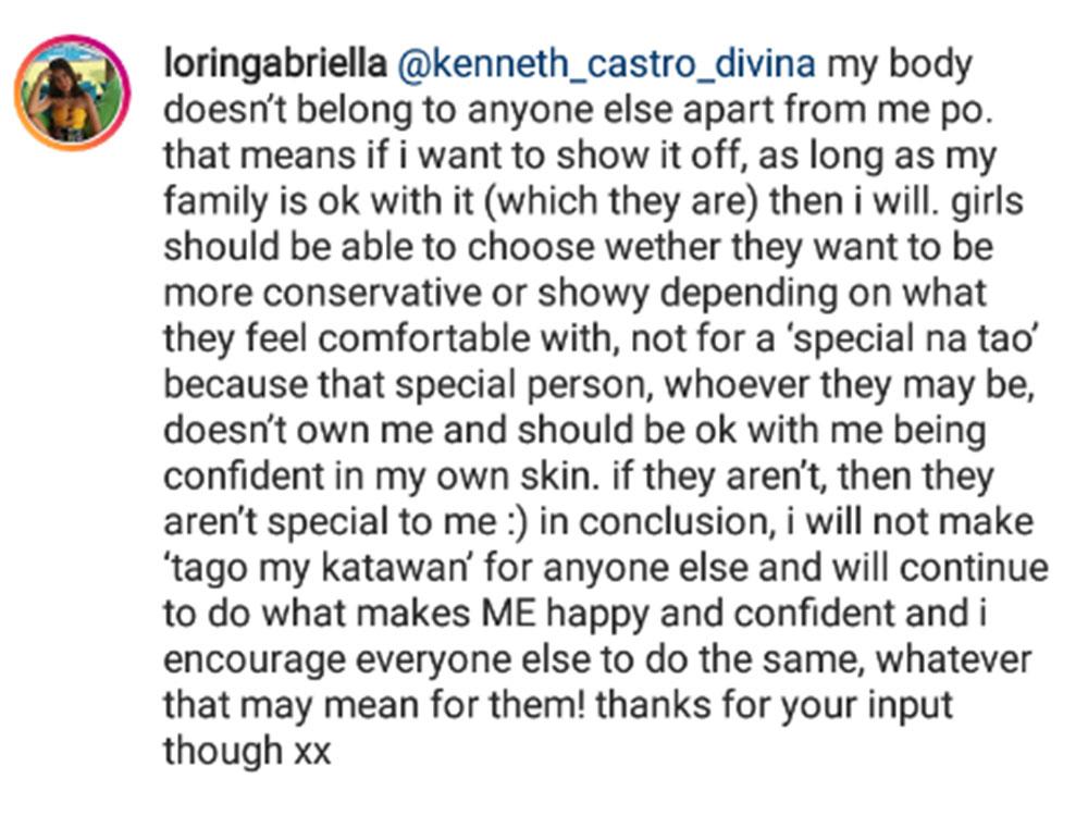 The photo seemed to have caught the "concern" of a particular netizen who advised her against showing too much skin.