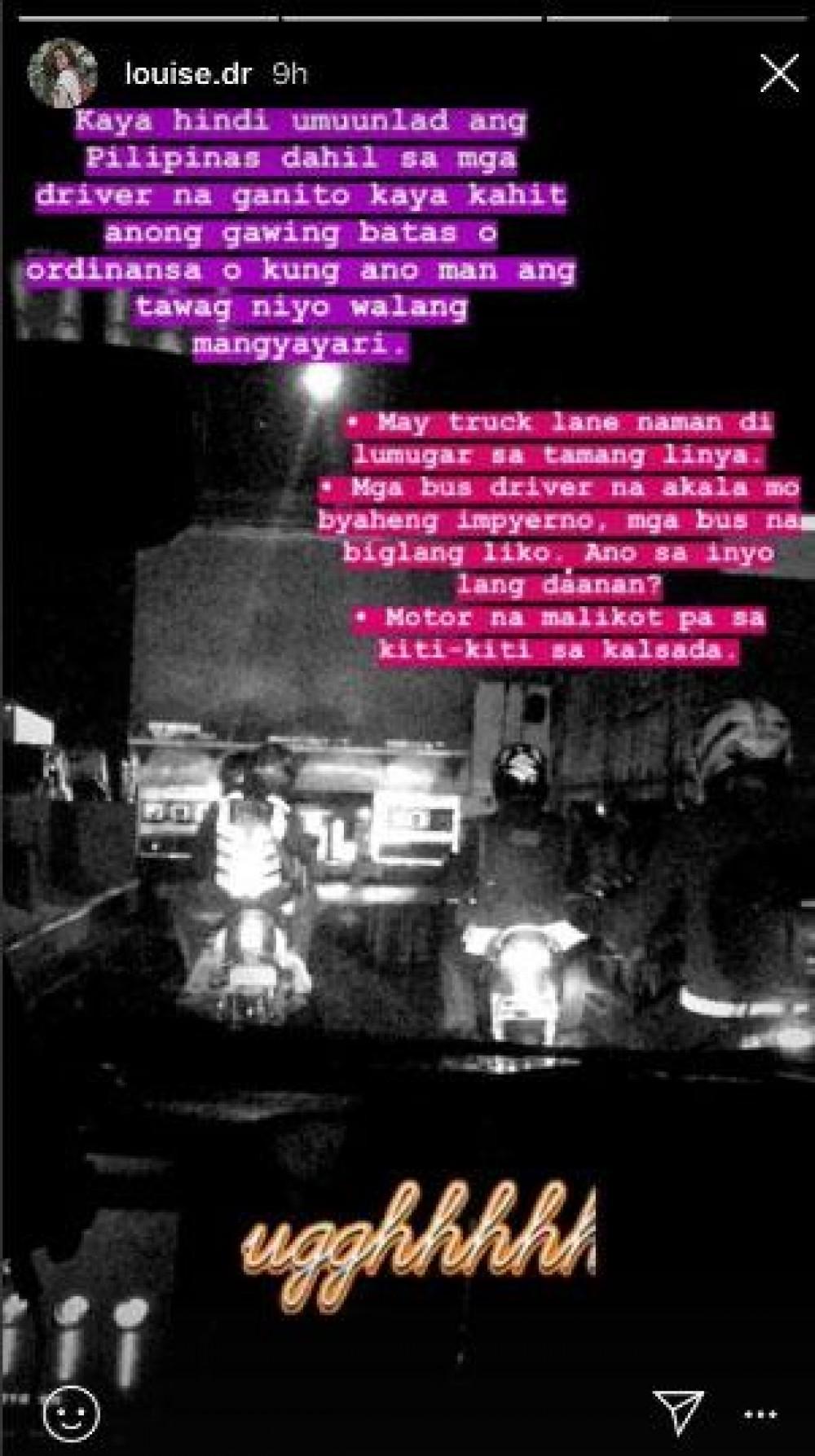 Sa post niya sa Instagram Stories, pinuna niya ang mga driver na hindi sumusunod sa batas trapiko.