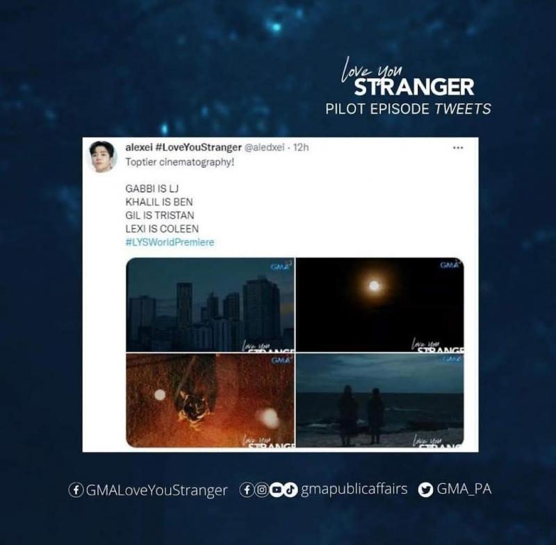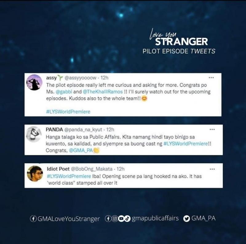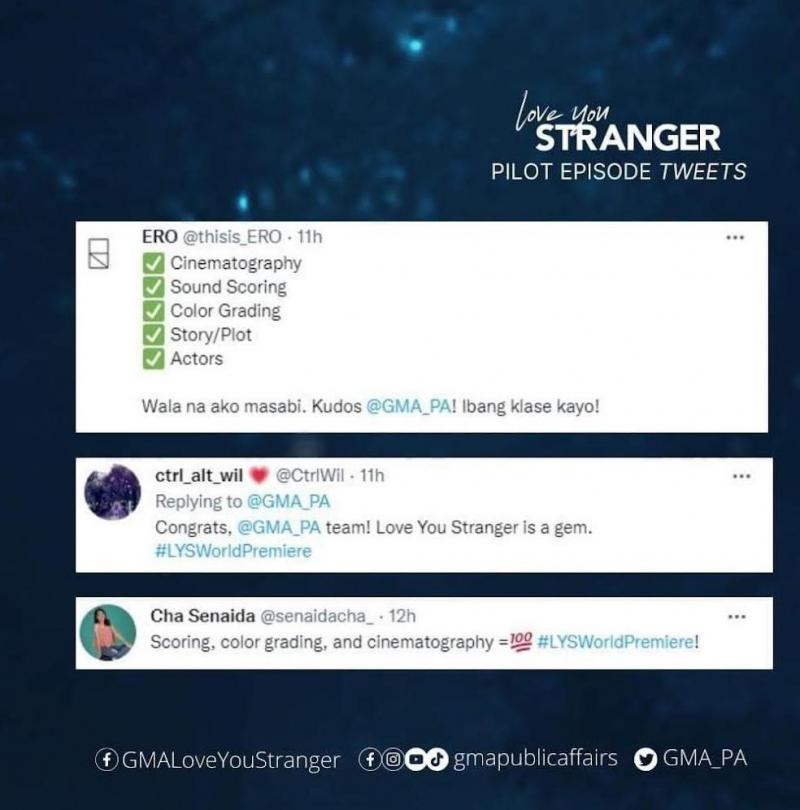 On Twitter, where the pilot episode's official hashtag #LYSworldpremiere made it to the trending topics last Monday, netizen @CtrlWil said, “Ganda ng cinematography ng Love You, Stranger. Ganda rin ng pilot. Kudos to @GMA_PA! I have a feeling I'll get hooked. #LYSWorldPremiere.”