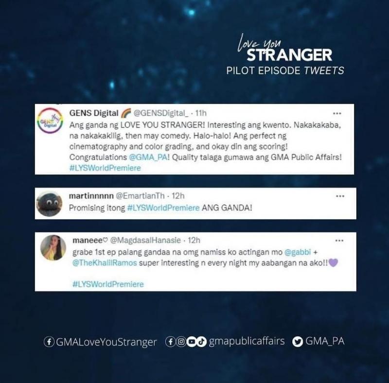 Meanwhile, @GENSDigital_ tweeted, “Ang ganda ng LOVE YOU STRANGER! Interesting ang kwento. Nakakakaba, na nakakakilig, then may comedy. Halo-halo! Ang perfect ng cinematography and color grading, and okay din ang scoring! Congratulations, @GMA_PA! Quality talaga gumawa ang GMA Public Affairs! #LYSWorldPremiere.”