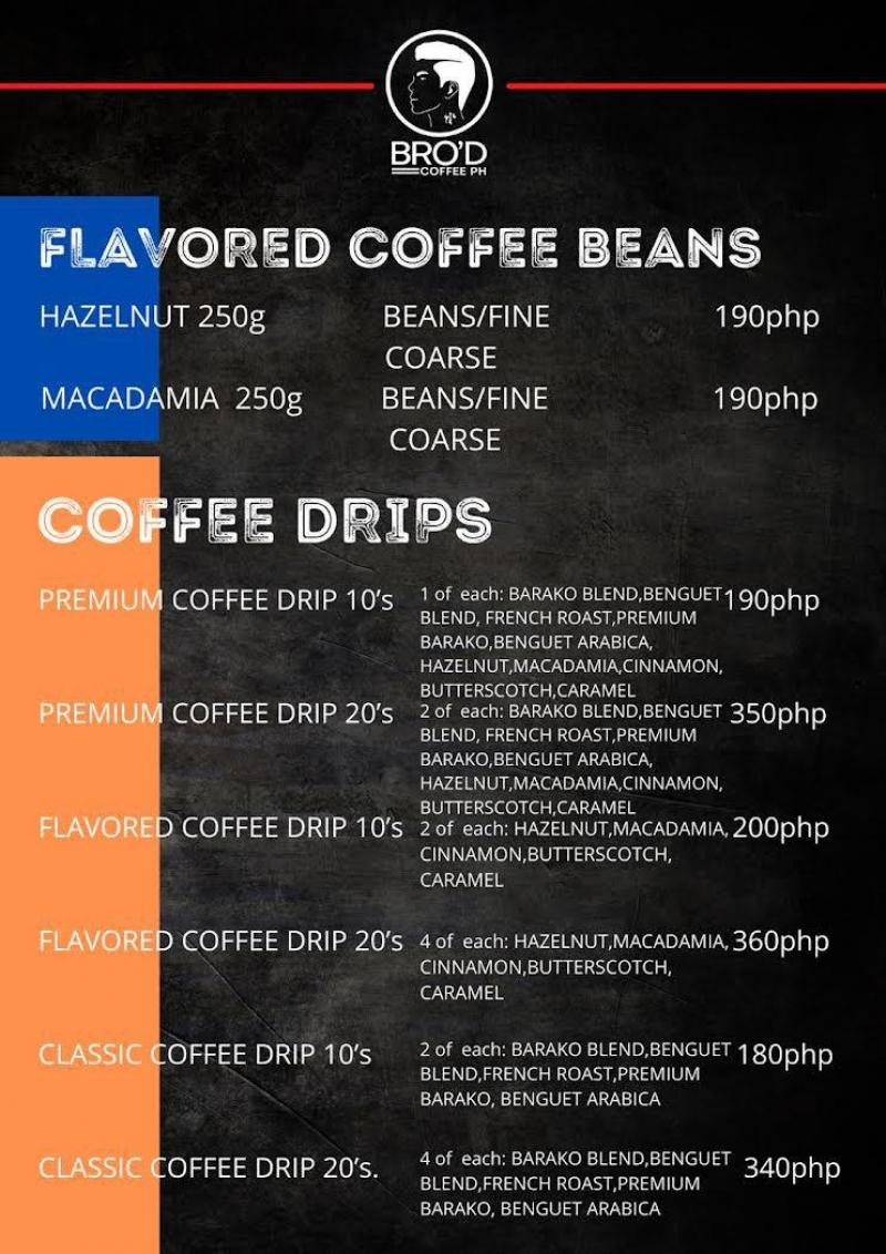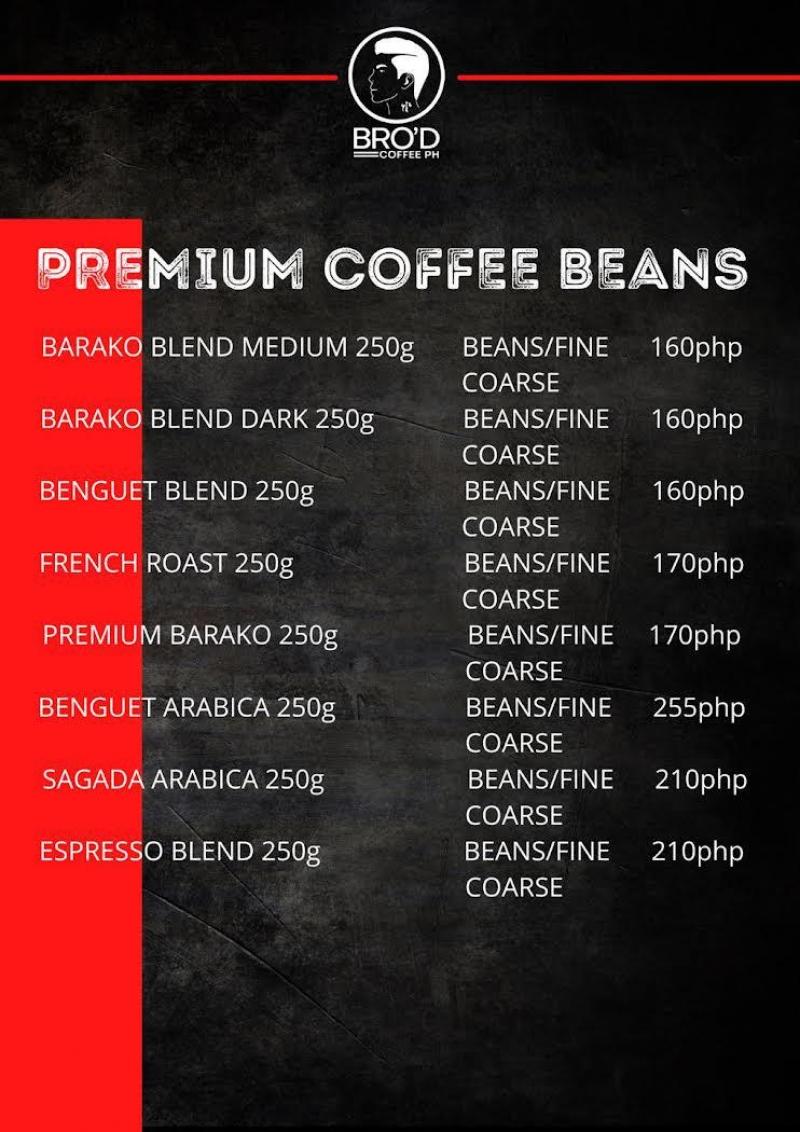 Bro'd Coffee PH sells different varieties of coffee such as Barako blend, Benguet Arabica, and Sagada Arabica. Also available are French Roast Coffee, Hazelnut Blend, and Macadamia Blend.