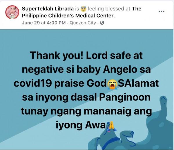 Malugod ding ibinalita ni Tekla kamakailan na negatibo sa COVID-19 ang anak. Tuluy-tuloy din ang natatanggap na tulong ng pamilya mula sa kanyang mga kasamahan sa industriya.