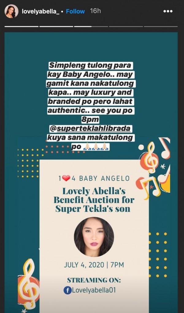 Ang kikitain sa benefit auction ni Lovely Abella ay mapupunta sa panggastos ni Tekla para sa operasyon ng kanyang anak na may anorectal malformation.