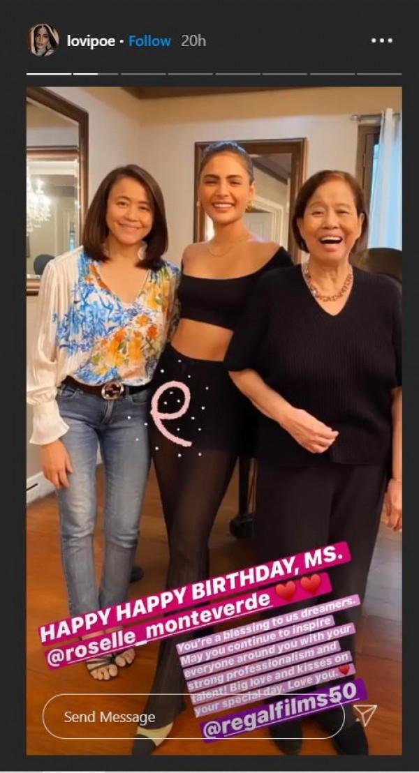 On her Instagram story, Lovi posted a throwback photo with Ms. Roselle and her mother, Regal Films matriarch Lily Monteverde.