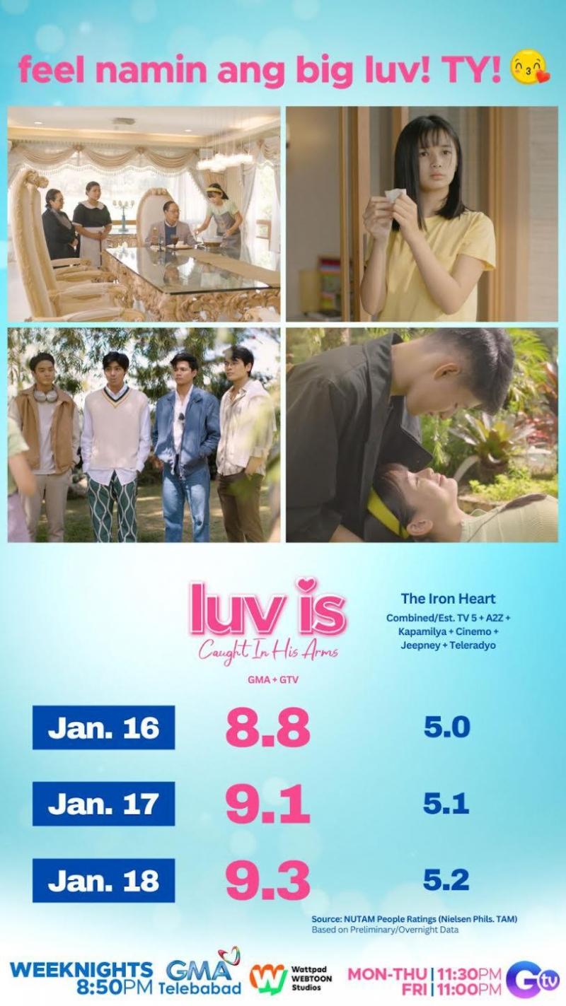 Tumabo ng magkakasunod na matataas na ratings ang bagong kilig series ng GMA na Luv is: Caught in His Arms sa unang tatlong gabi pa lamang nito sa GMA Telebabad.