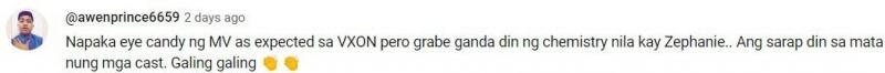 "Napaka-eye candy ng MV as expected sa VXON pero grabe ang ganda din ng chemistry nila kay Zephanie..Ang sarap din sa mata nung mga cast. Galing!," ani ng isang netizen.