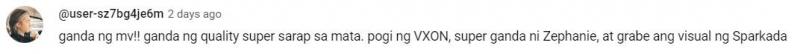 "Ganda ng mv!! ganda ng quality super sarap sa mata. Pogi ng VXON, super ganda ni Zephanie, at grabe ang visual ng Sparkada," dagdag ng isang fan.