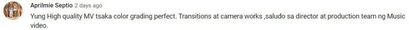 "'Yung high quality MV tsaka color grading perfect. Transitions at camera works, saludo sa director at production team ng music video," papuri ng isang netizen.