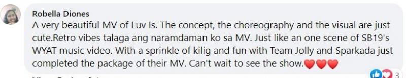 "A very beautiful MV of 'Luv is.' The concept, the choreography and the visual are just cute. Retro vibes talaga ang naramdaman ko sa MV. Just like one scene of SB19's WYAT music video. With a sprinkle of kilig and fun with Team Jolly and Sparkada just completed the package of their MV. Can't wait to see the show," mensahe ng isang netizen.