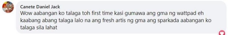 "Wow aabangan ko talaga to first time kasi gumawa ang GMA ng Wattpad [series] e, kaabang-abang talaga lalo na ang fresh artists ng GMA na Sparkada. Aabangan ko talaga sila lahat," usisa ng isa pang netizen.