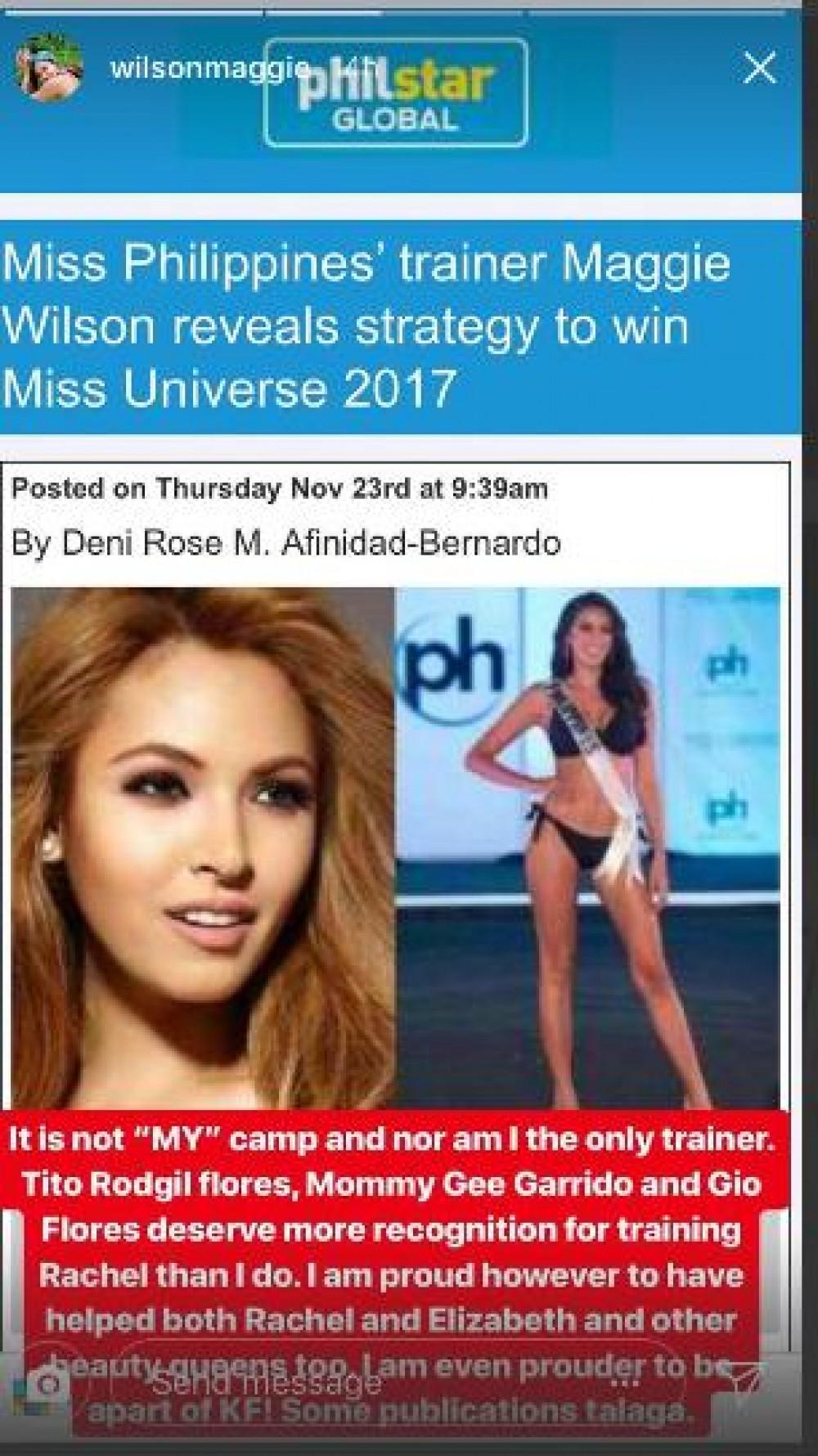 Former Miss World Philippines Maggie Wilson voiced out her concern about a misleading headline of a newspaper publication that she's the only trainer of Philippine bet Rachel Peters in the Miss Universe pageant.
